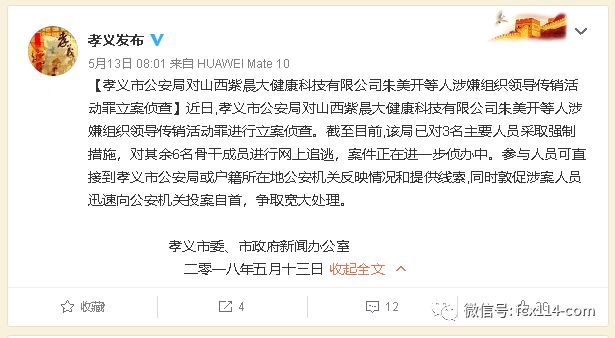 孝义市公安局对紫晨大健康朱美开等涉嫌传销立案侦查