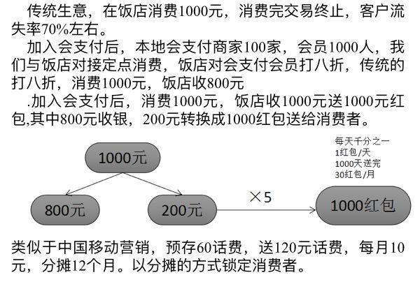 会支付商城一韩姓招商人员向国易网介绍,会支付商城主要以“区块链”来进行消费返现计算,累计消费500元就会拥有一个区块链“红包算力”,当返现满500元就会扣减一个“红包算力”,以此类推。 实际上,就是会支付商城的联盟商家在消费者消费后,向会支付商城报单并缴纳消费金额的20%,会支付就会在后期全返消费者的消费金额和商家交的费用,这些费用按每天万分之六的递减模式进行提现到帐。