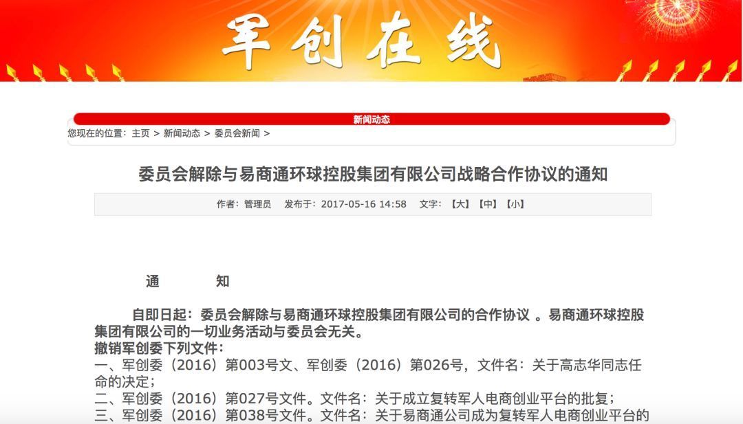 2017年5月,军创宣布解除与易商通的合作。此外,军创的团体全名为城乡小康发展促进中心复转军人创业工作委员会(下称“军创”),已被民政部社会组织网列为涉军的非法社会组织。