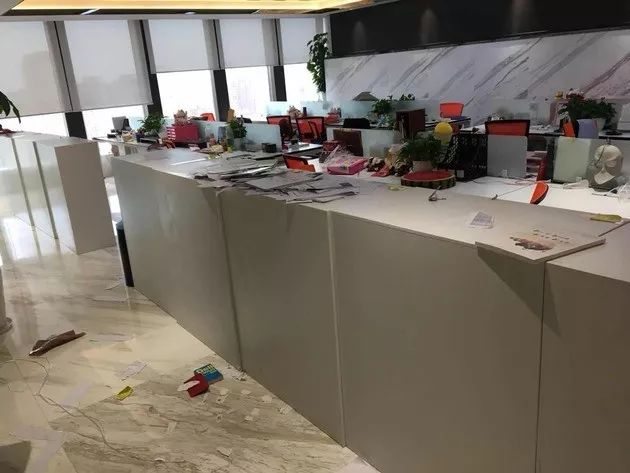 另外,值得注意的是,一些原先安放显示屏的墙壁位置,已经被拆除,只剩下线缆和裸露的墙壁。26、27层办公楼的地面上一些垃圾碎纸等也都撒落一地,一些小垃圾桶里堆满了碎纸屑,很明显是刻意进行处理过的,26层内一个大垃圾桶里堆满了文件等杂物。两层楼中的副总裁、总裁室、董事长等高管的办公室,也都空无一人,随处可见杂物堆放、矿泉水瓶满桌。