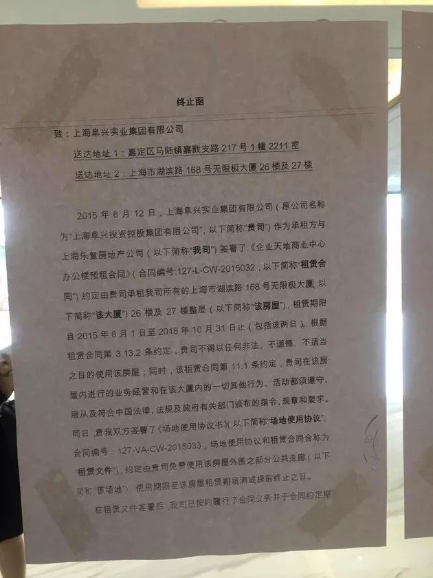 此外阜兴控股的办公室门外,也贴着上海乐复房地产公司给阜兴集团送达的通知函。