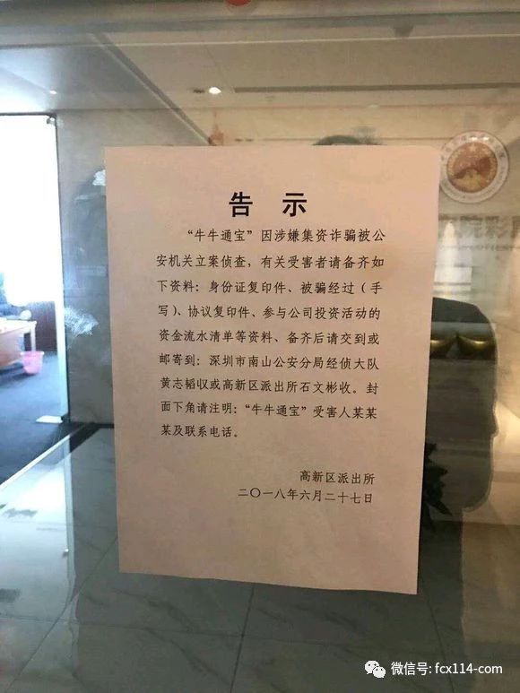 “牛牛通宝”因涉集资诈骗被公安机关立案侦查,有关受害者请备齐去下资料:身份证复印件、被骗经过(手写)、协议复印件、参与公司投资活动的资金流水清单等资料、备齐后请交到或邮寄到:深圳市南山公安分局经侦大队黄志韬收或高新区派出所石文彬收。封面下角请注明:“牛牛通宝”受害人某某某及联系电话。