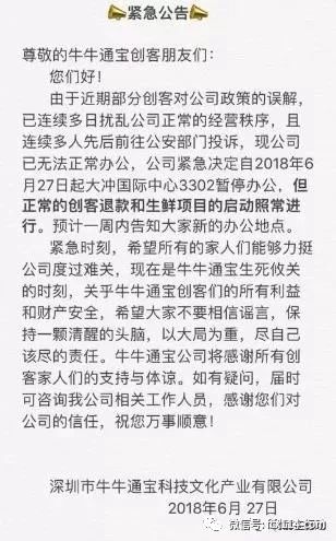 公告表示,牛牛通宝公司决定与鲜润社区强强联手,以解决当下金融政策下所面临的危机,将牛牛通宝公司所有创客的数据资产作价移至智慧社区生鲜,所有牛牛通宝公司未回本的创客平移至该平台后,即享有每周一以现金方式提现,周二到账。已回本的创客原架构保留,需投资激活账号后方可继续以现金方式提现。此外公告称,公司将数据全面平移至智慧社区生鲜,需要三个工作日(本周三至周五),平移期间所有收益暂停,预计下周一(2018年6月25日)恢复正常以现金方式提现。