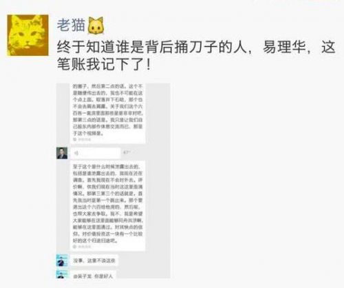 对于曝光的李笑来的这段谈话,可以说在业内引起了很大的反响和争议。作为谈话中的涉事者, 老猫之后在朋友圈发文称,终于知道谁是背后捅刀子的人,易理华,这笔帐我记下了。