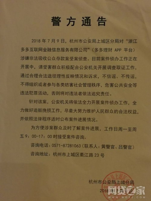 7月9日,杭州市公安局上城分局发布通告,称对多多理财(浙江多多互联网金融信息服务有限公司)涉嫌非法吸收公众存款案受案侦查,目前案件侦查正在开展中。