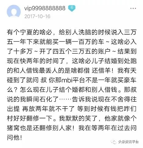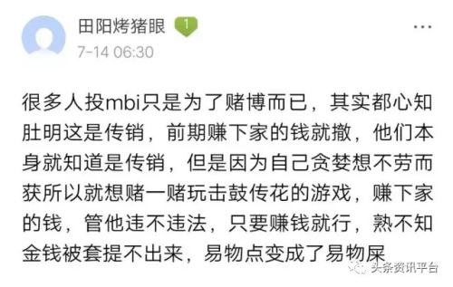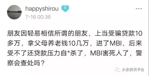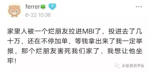 其实投了钱在mfc游戏理财平台的粉丝,没有任何无辜。只要你参加了mfc游戏理财拆分盘,无论你标榜自己多么善良多么道义,甚至站在道德高度指责这个心黑那个心狠,在事情本质看来本身就是一件很可笑的事,因为你身在mfc拆分盘骗局中的本身就是骗子中的一员,你很气愤你要叫骂,无非是别人说的搞的东西,挡了你的财路。二是在里面被洗脑了,说百度不能信,甚至是互联网里任何人都不要信,只信自己,而且时刻保持警惕。但是你要知道钱在你兜里是你的钱,钱出去后,投了钱进mfc游戏理财平台以后,未必能回来。 mfc游戏理财平台,这个有人被抓捕,有人想自杀,有人暴富,有人只是回本小赚以及还有人在回本的路上挣扎的地方,机会有,但并不是每个MBI粉丝都能抓住,时机不一样,能骗来更多人加入mfc游戏理财平台的机会过去了,永远要记得君子爱财,取之有道。