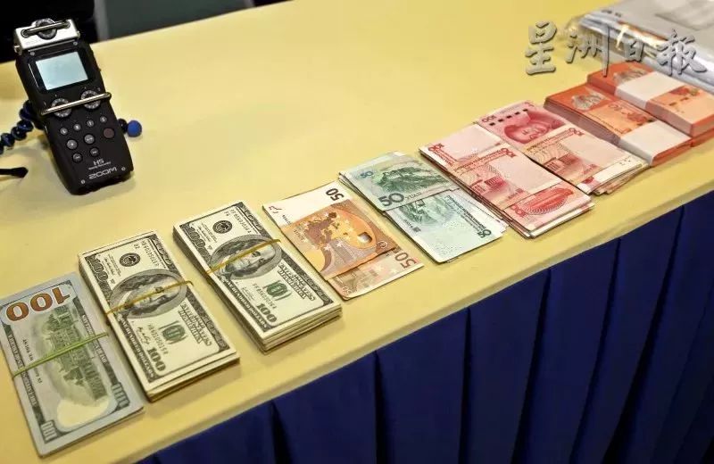执法单位在取缔行动中起获各种货币,总价值达9万3879令吉20仙。(图:星洲日报)