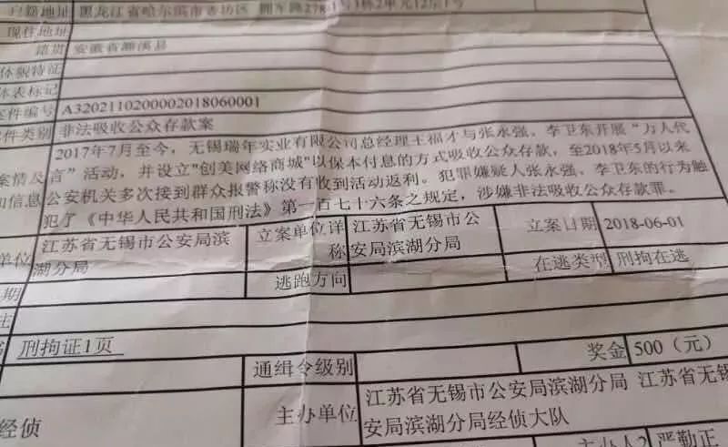 基金君进一步搜索到一份在逃人员登记表,上面写着,2017年7月至今,瑞年实业王福才与张永强、李卫东开展“万人代言”活动,并设立“创美网络商城”以保本付息的方式吸收公众存款,至2018年5月以来公安机关多次接到群众报警称没有收到活动返利,犯罪嫌疑人张永强、李卫东的行为涉嫌非法吸收公众存款罪。