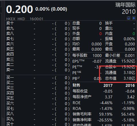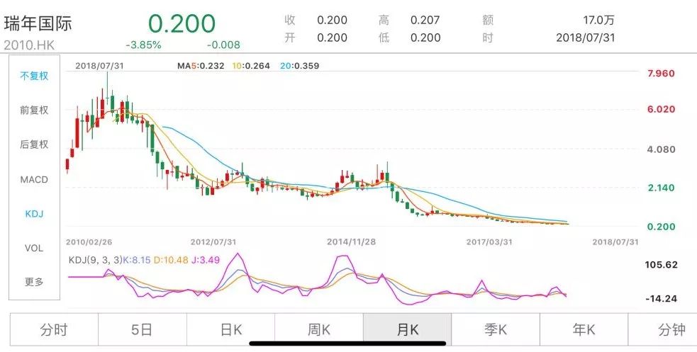 截至目前,瑞年国际的股价为0.2元/股,从上市后最高点的7块多算起,跌幅已经超过了97%。