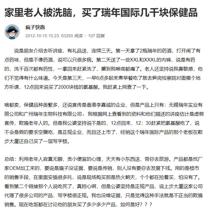 老人去听了瑞年氨基酸的保健品讲座,说这是上市公司,去苏州听的,回来在说要加入这公司,自己花一万买保健,成为会员然后在发展下线让别人去听课,让别人也掏一万,这样上线多会有提成,有几个人已经返本了,就是花一万,返一万多,有的人已经奖励到2台奔驰车了,他说本来自己也不要相信,可是看到认识的人多已经是会员了,而且多返本了,以后还会源源不断的有人加入,上线多有提成,就心动了。想问问大家,瑞年这公司,靠谱吗?