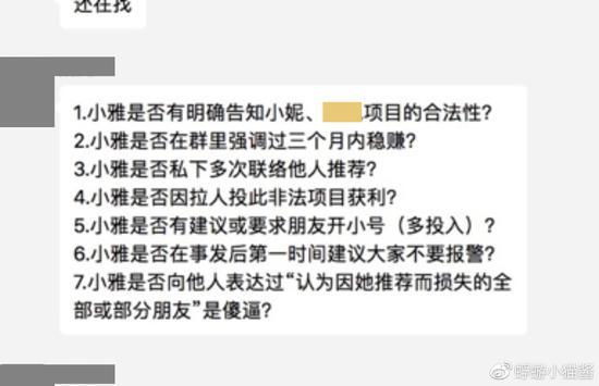 @蜉蝣小猫酱 称,在孙小雅在群内宣传该项目时,有数名群友提出此项目为传销,但孙小雅视而不见,并回复“那又怎样”、“反正赚钱”。