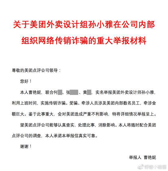 9月3日下午消息,今日微博网友@蜉蝣小猫酱 发布长文,称自己是美团员工曹艳妮,联合何某、张某、黄某,实名联合举报美团外卖设计师孙小雅利用上班时间,实施传销诈骗,并称受骗、牵涉人员涉及美团内部数名员工,金额巨大。希望美团点评公司能够认真查实,处理此事。