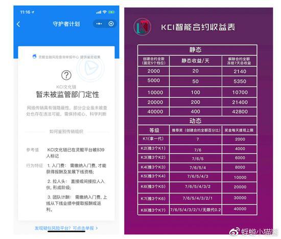 @蜉蝣小猫酱 表示,其具体玩法为:上家发KCI币——上家承诺半个月后以高价回收KCI币——下线买KCI币——上线抽取佣金——上家跑路——KCI币成废纸。