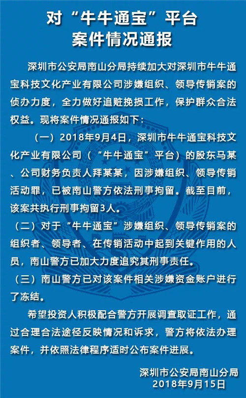 9月4日,深圳市牛牛通宝科技文化产业有限公司(即”牛牛通宝”)的股东马某、公司财务负责人拜某某,因涉嫌组织、领导传销活动罪,已被南山警方依法刑事拘留。案件的最新进展是: