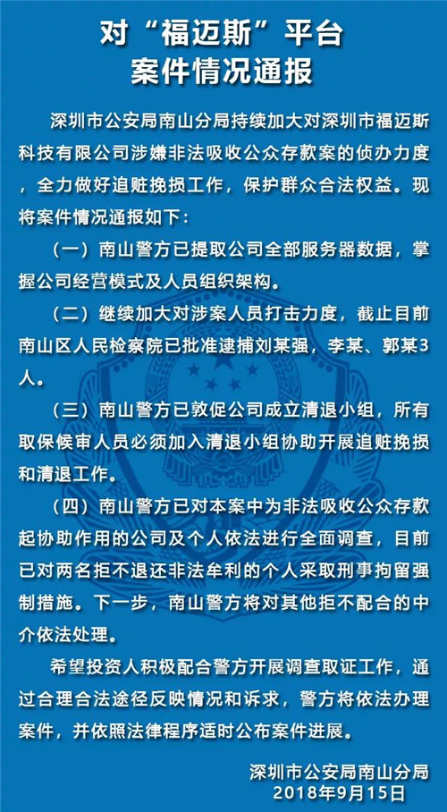 1、福迈斯全部服务器数据已被南山警方提取,且警方已掌握公司经营模式及人员组织架构,加大对涉案人员打击力度,截至目前,南山区人民检察院已批准逮捕刘某强,李某、郭某3人。