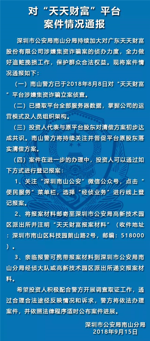 据悉,8月8日,南山警方对天天财富平台以涉嫌集资诈骗立案侦查。目前,已提取平台全部服务器数据,掌握公司的运营模式及人员组织架构。投资人代表与原平台股东对清偿方案初步达成共识。南山警方将持续关注并督促平台原股东落实清偿方案。