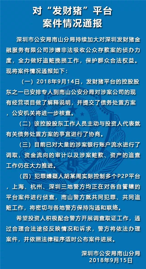 9月14日,发财猪平台的控股股东之一已安排专人到南山公安分局对涉案公司的现有经营项目做了解释说明,并提交了债务处置方案,公安机关将进一步核查: