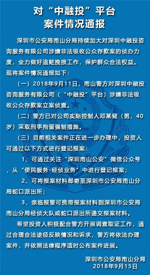 9月11日,南山警方对深圳中融投咨询服务有限公司(即“中融投”平台)涉嫌非法吸收公众存款案立案侦查。警方已对公司实际控制人邓某健(男,40岁)采取刑事拘留强制措施。