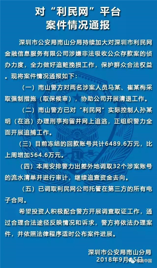 9月15日,深圳警方对“利民网”平台进行了最新的案件通报: