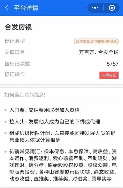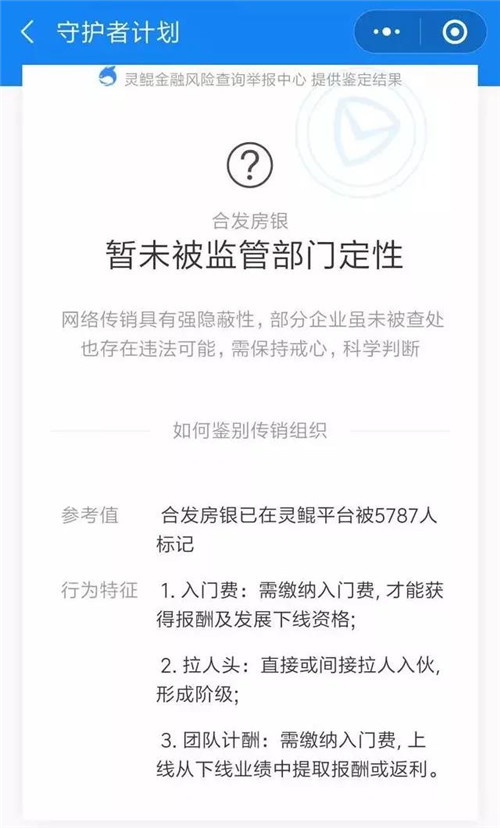 记者再次登录守护者计划和灵鲲金融风险查询举报中心小程序,合发全球(原名:合发房银)仍暂未被监管部门定性。