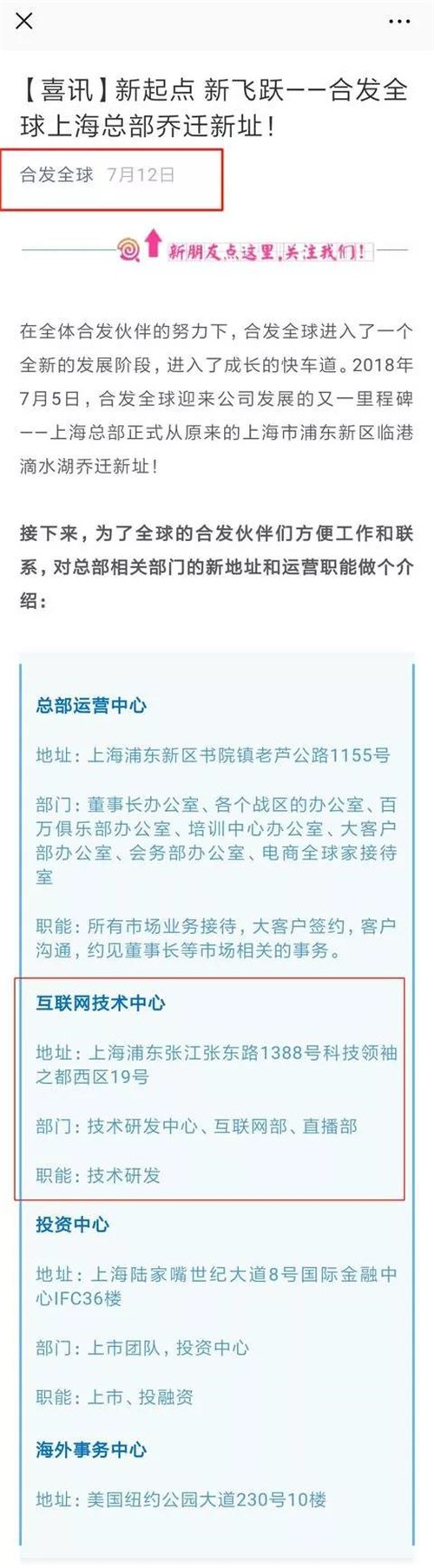 在合发全球公众号今年7月12号发布的一篇《新起点 新飞跃——合发全球上海总部乔迁新址》里,有提到互联网技术中心的地址:上海浦东张江张东路1388号科技领袖之都西区19号,属于技术研发中心、互联网部和直播部,职能是技术研发。