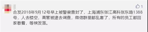 据网传消息爆料,合发全球2018年9月12日上午被警察查封,上海浦东张江高科张东路1388号已人去楼空,高管被逮去调查,微信群都乱套了,所有员工都回家歇着,等候发落。