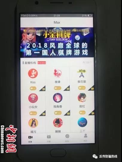 据嘉兴市公安局网警支队支队长潘祖宏介绍,3月,嘉兴市公安局在工作中发现一款名为“Max”的手机APP软件聚合110多个淫秽色情直播源,储存数1.8万余部淫秽色情视频,通过层层发展代理、招揽客户购买会员卡密(类似于手机充值卡)的方式非法牟利。