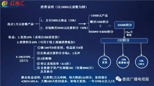 据查,犯罪嫌疑人宣称,参与者在红商汇投资1万元购买“套餐产品”除获得相应产品,还将获得6.6万的积分,按照红商汇的规则,一个积分就相当于一块钱。这些积分不会一次性直接到帐而是按照每天千分之二进行释放,也就是说投资者每天获得132个积分直至全部6.6万积分到帐。到帐的积分可以卖给其他会员,也可以按照一对一的模式转换成红商汇发行的数字货币红商链。按其说法计算,如果投资1万并持续复投一年后,一年将收益135万元。