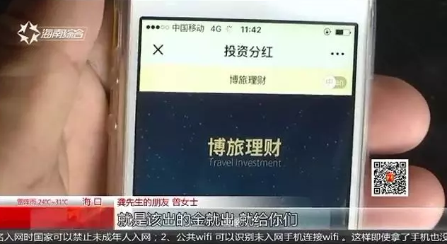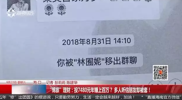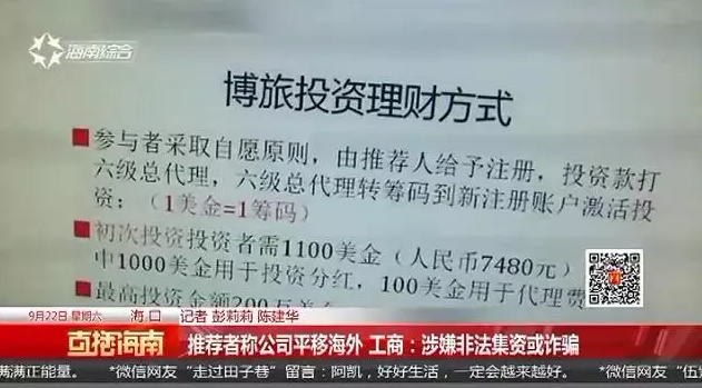 【电话采访】海口居民 高女士:我是投了13600(记者:取出过钱吗?)没取出过,每天都有分红,但是按投的那个额度来的比例来分,他说要满100美金才能取,但是那时候都还没满的时候,他就开始说系统关网了,不能提现了什么的。就是我经常提出疑问,所以就把我们踢出了。据这些投资人介绍,他们都是在身边的朋友推荐下,进入博旅理财项目的。平台无法提现后,群主也解释说是系统问题,如果继续追问,就被群主提出群,现在,他们都很担心自己的本钱拿不回来。直播海南记者报道。
