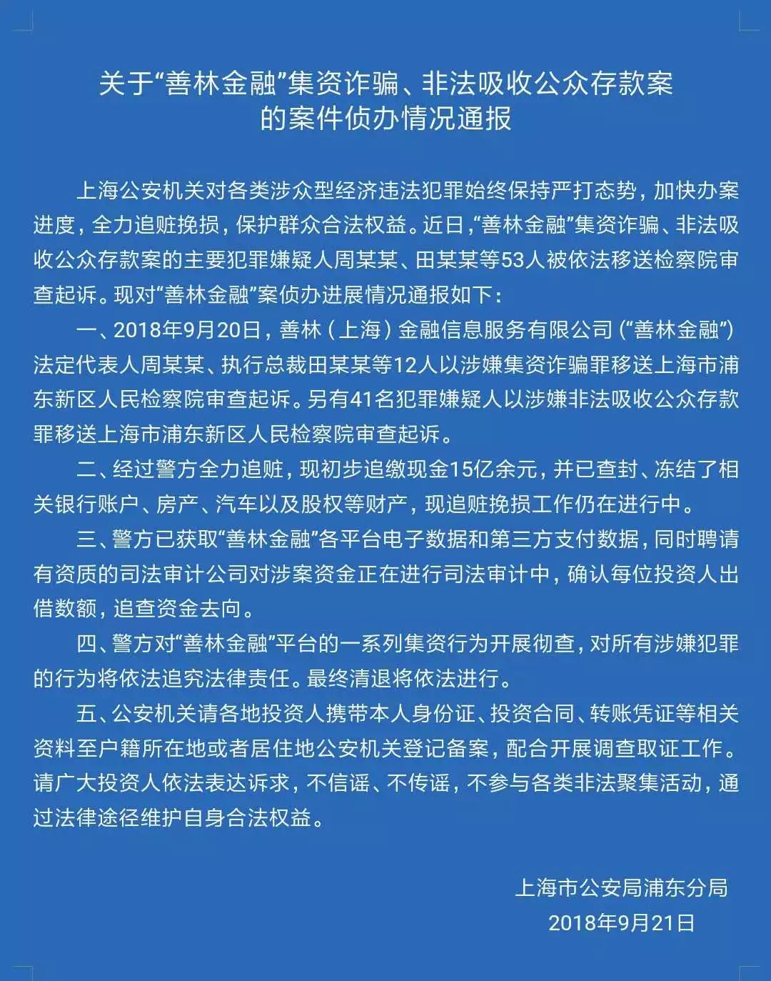 据上海市公安局官方公众号“警民直通车上海”,9月20日,上海市公安局浦东分局将善林(上海)金融信息服务有限公司(“善林金融”)法定代表人周某某,执行总裁田某某等12人以涉嫌集资诈骗罪移送浦东新区人民检察院审查起诉,另有41名犯罪嫌疑人以涉嫌非法吸收公众存款罪移送浦东新区人民检察院审查起诉。