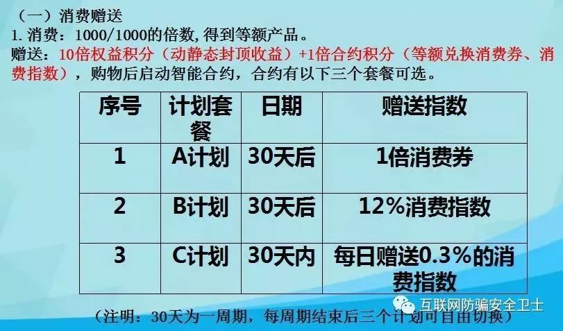 “未来E购”提供了3个返还套餐供投资人选择,一种是每个月返还消费金额同等额度的消费券,消费券可以在该商城购买东西;另外一种是每个月返还消费金额12%的消费指数,一个消费指数等于一元人民币并可进行提现,直至返还的金额达到10倍权益积分;第三种模式则是每天返还消费金额的千分之三,返还到帐即可提现,日积月累直到10倍赠送的积分返还完毕。
