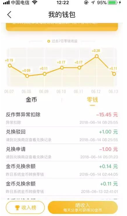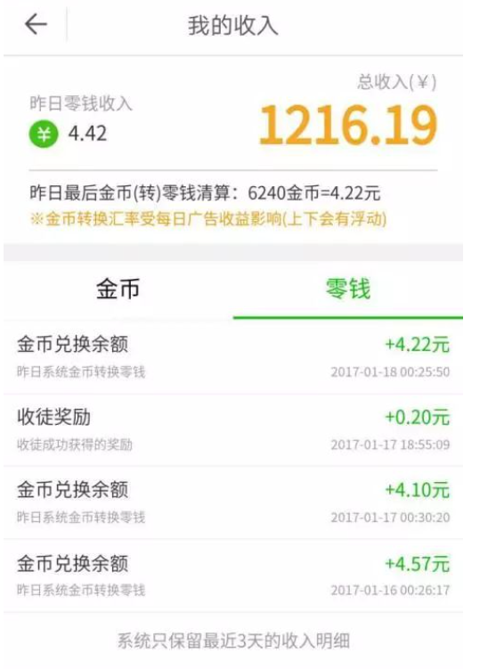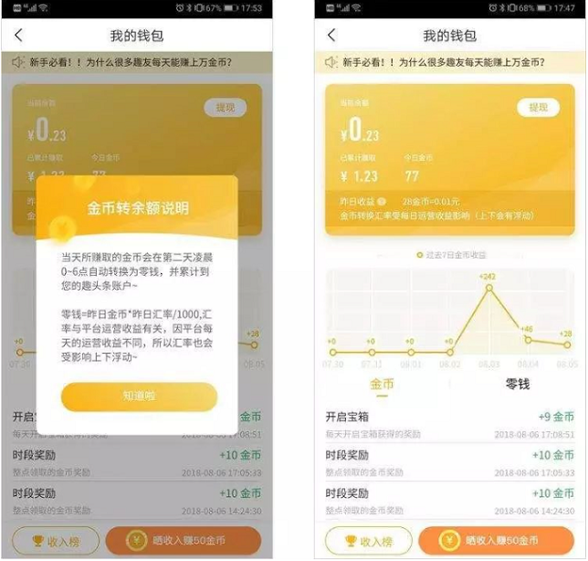 令人心动的是,在这里获得的所有金币,都可换成现金,通过微信、支付宝提现。目前来看,以当日转换汇率为准,大约1000到1500金币可换算成1元。趣头条官方称,金币转换汇率波动受每日运营收益影响。从这点上看,代表着趣头条掌握了议价权,使得补贴金额与营收金额可以一直维持在一定的比例。