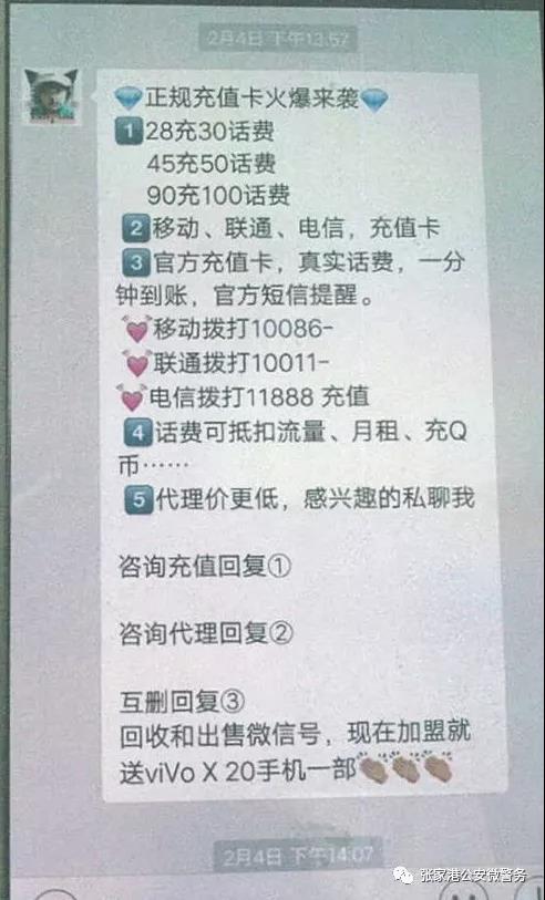 暂住在冶金园(锦丰镇)的张女士从事微商生意,今年2月24日下午,有人在微信上主动请求添加张女士为好友,以为有生意上门,张女士很快通过。可是对方却并没有找张女士询问产品,而是给她发了一条出售电话充值卡的信息。刚好张女士想给手机充值,便花28元购买了一张面值30元的手机充值卡,不一会儿,张女士便收到了话费充值成功的短信通知。