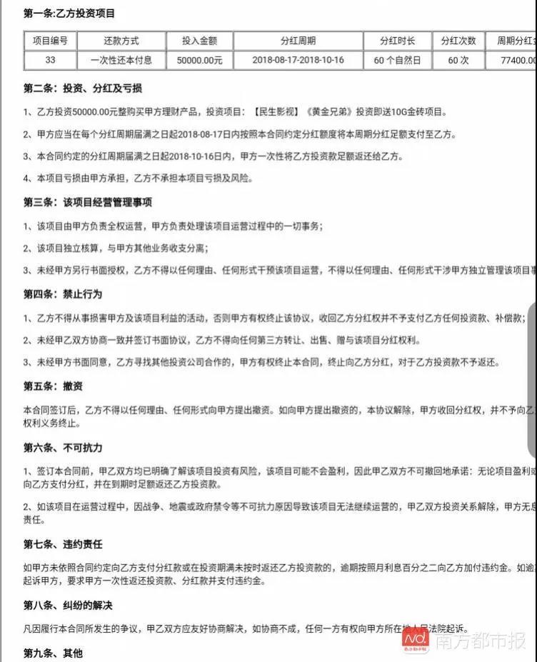 高收益往往与高风险相伴。南都记者在多份“民影视”投资合同中看到,平台在合同中标明了分红周期、分红次数及分红金额。另外,合同指出项目亏损由平台承担,投资人不承担亏损风险。在合同中,“分红及亏损”一项的细则较多,多是无条件维护乙方利益。违约责任、解决纠纷等与风险相关的条款则较少。