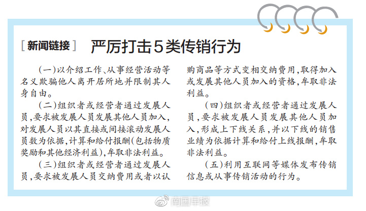 南宁市政府近日印发《关于依法严厉打击传销行为的通告》,决定在全市范围内开展专项行动,严打“以介绍工作为名限制人身自由”等5类传销行为,并公布30个南宁市各地受理传销行为的举报电话。