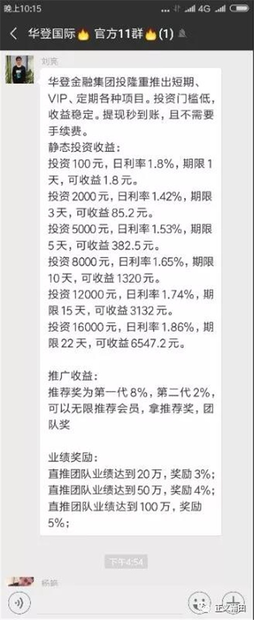 该团伙不断在微信群内虚构各种日息在1.8%--3%之间不等投资项目,通过伪造“会员”的充值金额和收益情况,展示该平台投资项目的收益预期,以此骗取网友信任,诱骗其在网站和手机APP上注册会员充值投资。