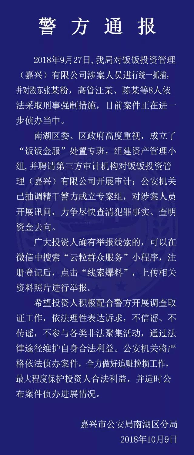 根据通报,9月27日,警方对饭饭投资管理(嘉兴)有限公司涉案人员进行统一抓捕,并对股东张某粉,高管汪某、陈某等8人依法采取刑事强制措施,目前案件正在进步侦办当中。