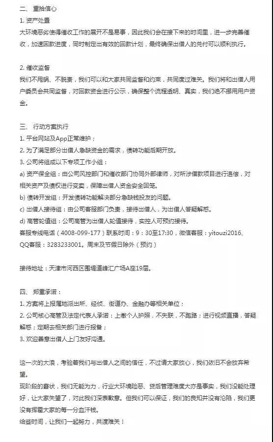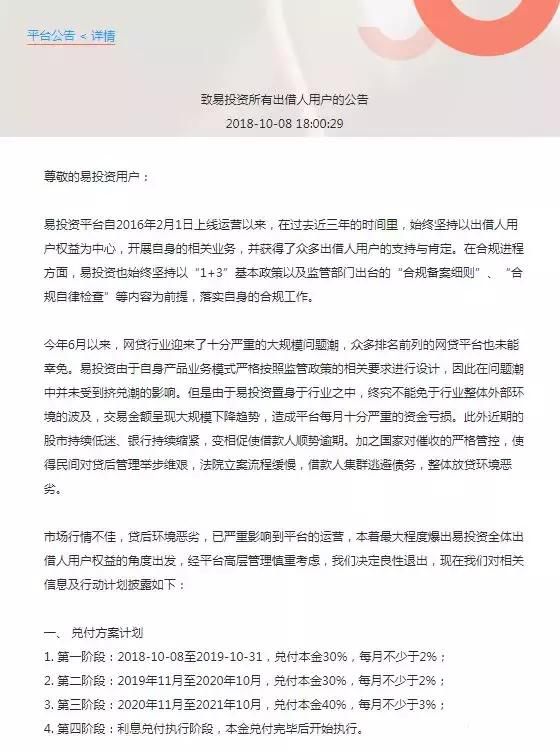 国庆节刚过!网贷平台易投资因市场行情不佳,贷后环境恶劣,已严重影响到平台的运营,本着最大程度爆出易投资全体出借人用户权益的角度出发,经平台高层管理慎重考虑,决定良性退出。在10月8日晚间发布“致易投资所有出借人用户的公告”,提到平台良性退出网贷,并承诺公司核心高管及法定代表人承诺:上缴个人护照,不失联,不跑路;进行视频直播,答疑解惑;定期去相关部门进行报备。