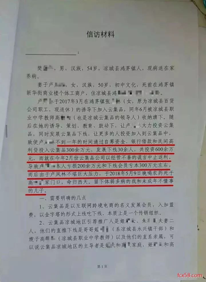 致使卢女士不到一年的时间通过自筹资金、银行借款和民间高利贷投入云集品300余万元,发展下线30余人,共投资600余万元,而就在今年2月份云集品公司以经营不善的谎言中止返利导致卢女士本人亏损200余万元和下线会员亏本300万元左右。而后由于卢女士不堪巨大压力,于2018年5月9日晚喝农药死于高某某家门口,命归西天。留下体弱多病的丈夫和未成年不懂事的儿子。(文字摘自材料)