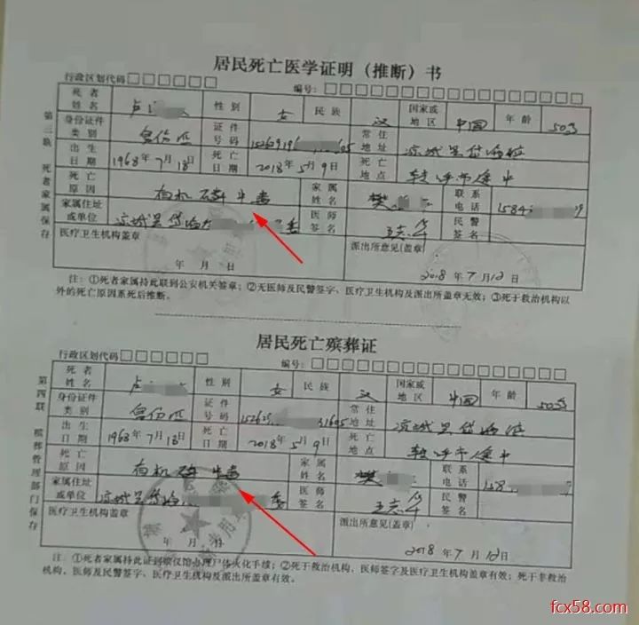 根据死者的死亡医学证明书显示,死者卢女士的死亡原因是:有机磷中毒。