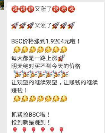 不仅如此,信链通发行的“BSC”号称只涨不跌,业内称之为“单边上扬”。招商人员继续介绍,“BSC”每发行100万枚则币价上涨0.1元,粗略估算每三天可以涨一毛钱。如果以发行6000万枚来计算,“BSC”将涨到7元一枚,截止发稿,信链通的粉丝群里面已经打出宣传,“BSC”已经涨到1.9204元。