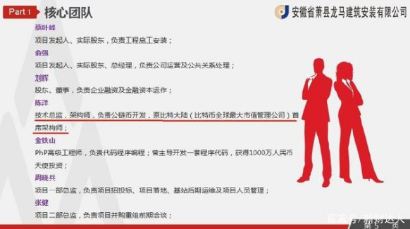 此外,信链通一直提到的重要合作伙伴,也就是负责5G基站安置的安徽某公司,在其提供的核心团队介绍可以看到,一家设备安装公司的技术总监居然是一位擅长数字货币发行的精英,自称曾任比特大陆的首席架构师,着实让人怀疑该公司的真正作用。