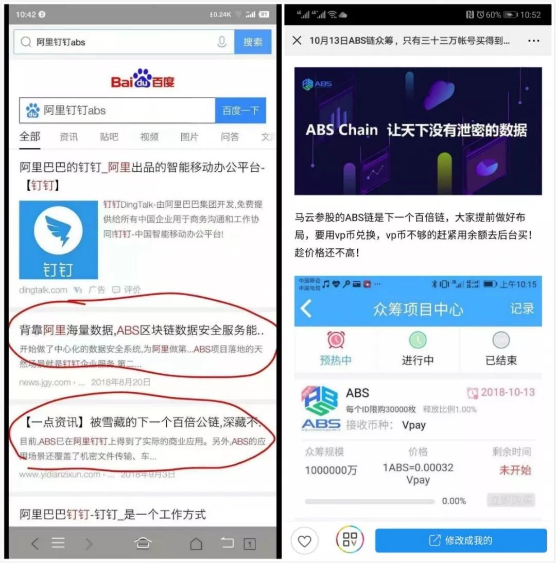 左为网上的假新闻,右为Vpay上的ABS链众筹页面