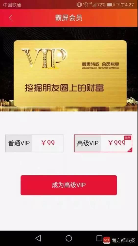 在“霸屏天下”APP中,南都记者看到,支付99元成为普通会员,高级会员则要999元。对于普通会员,领取所谓任务发朋友圈,然后保留两小时,再提交任务截图上传,可赚8元,操作比较简单。同样,高级会员也是以上步骤,只不过赚的更多,每天40元。