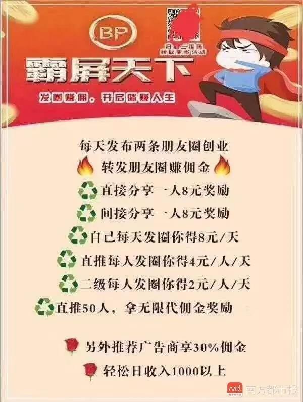 “发圈赚佣,开启躺赚人生”,这是“霸屏天下”APP的一句宣传口号。“只需投资99元或999元,每天发两条朋友圈,推荐他人加入,就能获得可观的静态和动态奖励。”从今年9月初上线至今,短短一个月时间,没有任何实体项目的“霸屏天下”据称已发展50万会员。而开发APP软件只需几万元成本。有的会员明知其为骗局或涉嫌传销,但他们只想捞一笔再走,“因为目前还没有崩盘”。