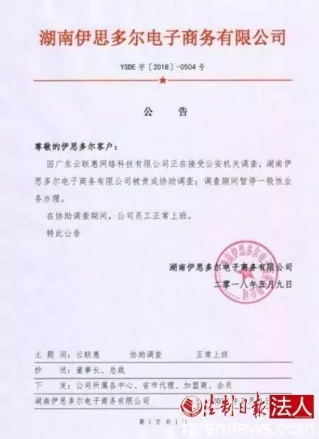 2018年5月9日,伊思多尔发布公告称,因广东云联惠网络科技有限公司正在接受公安机关调查,伊思多尔被责成协助调查,调查期间暂停一般性业务办理。该公告同时还称,在协助调查期间,公司员工正常上班。该公告抄送伊思多尔董事长和总裁,下发给公司所属各中心、省市代理、加盟商和会员。