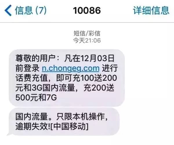近期冒充中国移动充100送200案件高发。犯罪分子伪装成运营商,向市民发送充话费送话费的虚假信息。当市民点击短信内的充值链接,进行一系列的话费充值操作后,不仅显示无法成功充值,其银行卡内的资金还会被人悄悄转走。目前已有多位市民上当,被转走金额最高上万元,最低几百元。