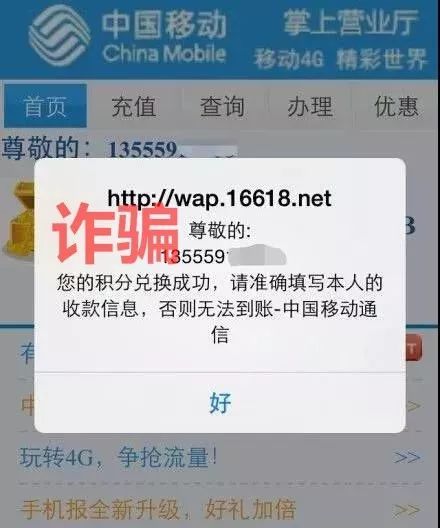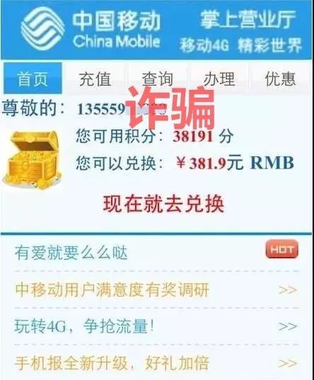 另外,关于移动积分兑换,目前只有通过官网积分商城一种方式,并且一般是话费、礼品等,绝不会以现金形式,更不会要求用户提供银行账号、身份证、密码等个人信息。”,类似网址尽量不要点击,以防中毒后个人信息泄露造成损失。网友出现了受骗的情况,移动公司表示非常同情和理解,但是移动公司也是受害者,对于这样的冒充诈骗行为也没有办法,只能建议网友报警。