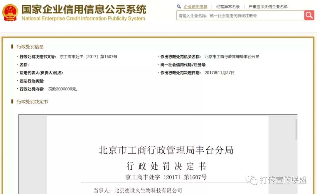 此外,北京德世久生物科技有限公司因发布虚假广告被北京市工商局丰台分局罚款200万元。