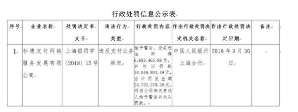 10月12日,央行上海分行公布行政处罚信息,第三方支付公司杉德支付被罚没2473万元。处罚信息显示,杉德支付因违反支付业务规定,被央行上海分行给予警告,没收违法所得6683465.89元,并处以罚款18049804.49元,合计罚没金额24733270.38元;并对该公司相关责任人给予警告并处以罚款。